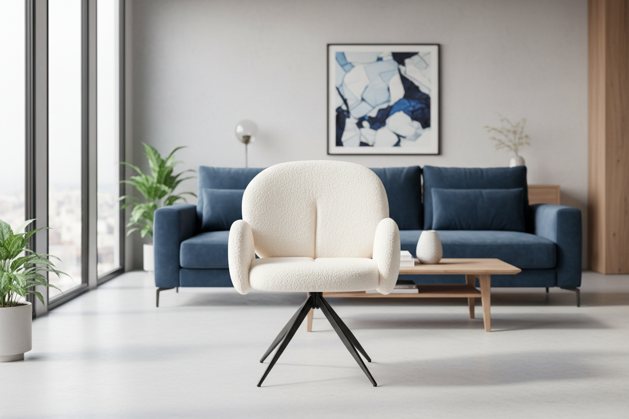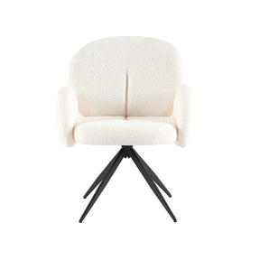 La silla de comedor Ayelet en color beige con movimiento destaca por su diseño moderno y elegante. Cuenta con un asiento tapizado de líneas suaves y respaldo envolvente que brinda mayor comodidad, complementado por una base metálica negra con sistema giratorio, que aporta funcionalidad y dinamismo al espacio. Ideal para comedores contemporáneos, combina confort, estabilidad y estilo sofisticado para uso residencial o comercial.