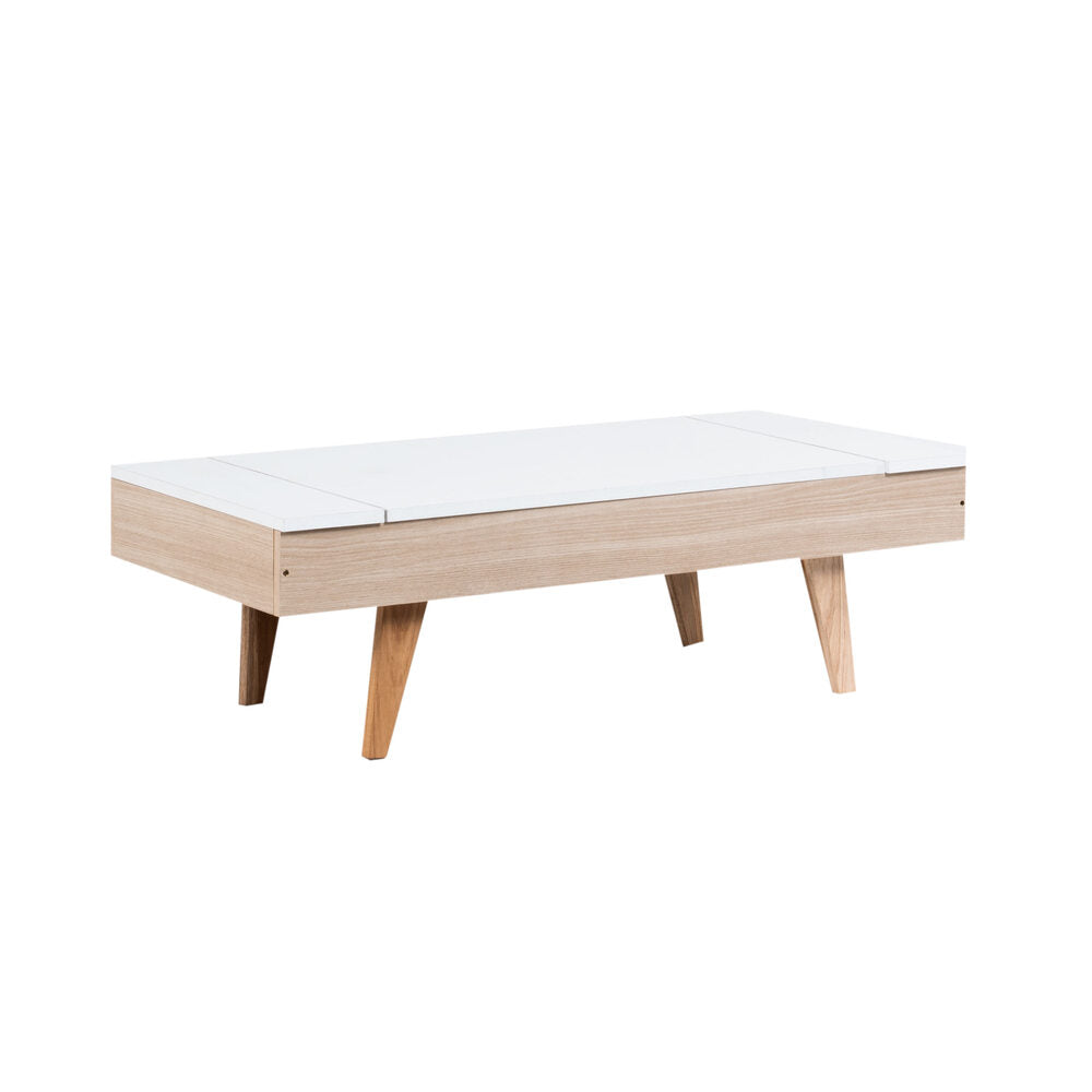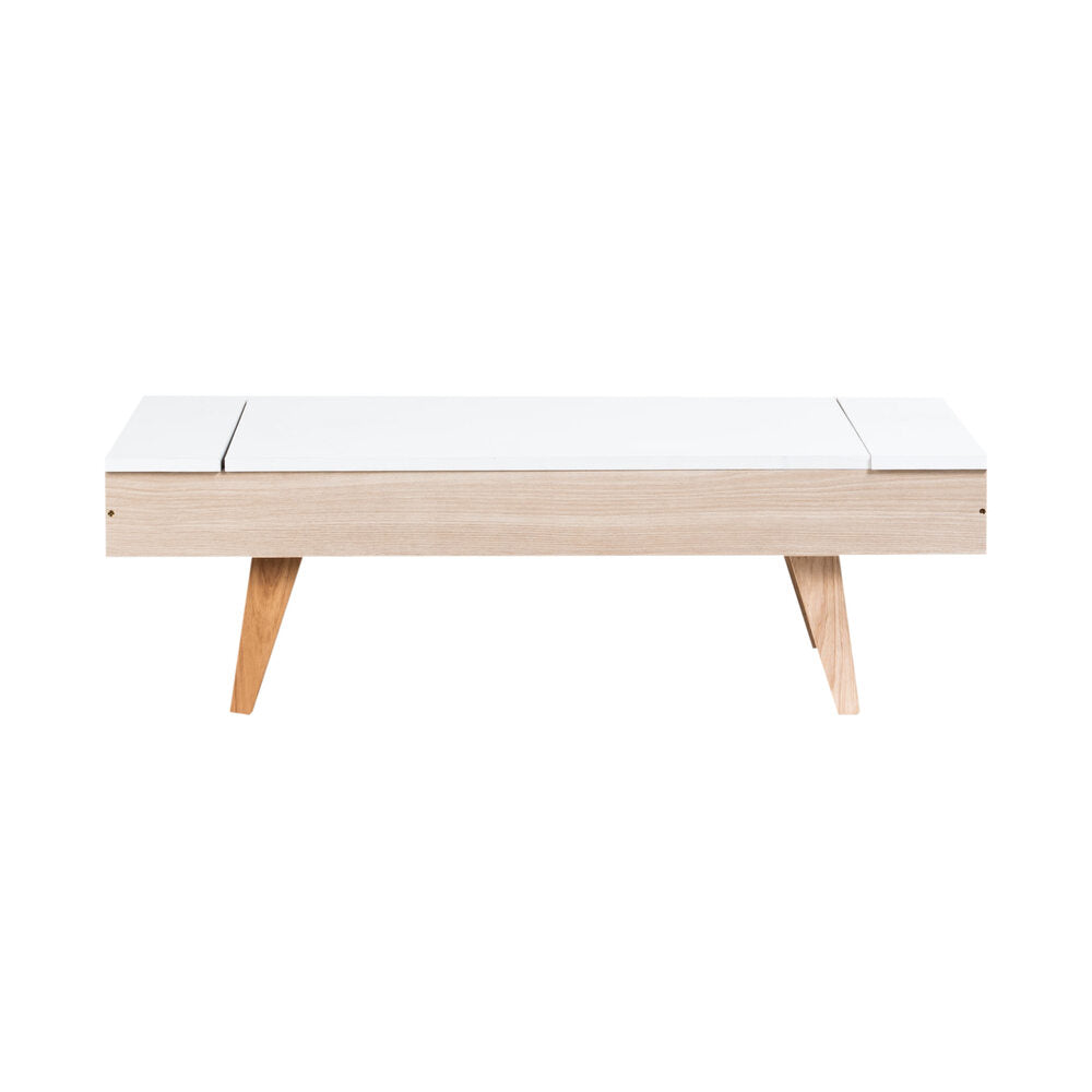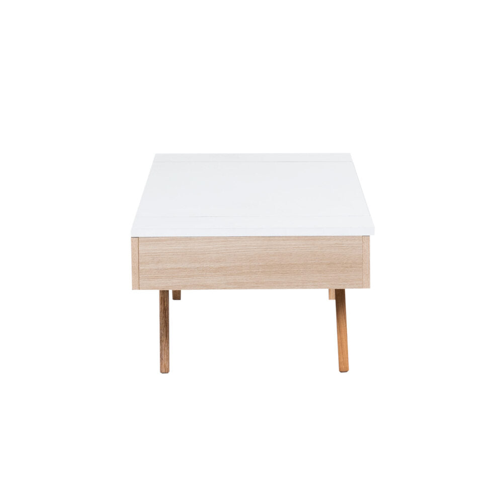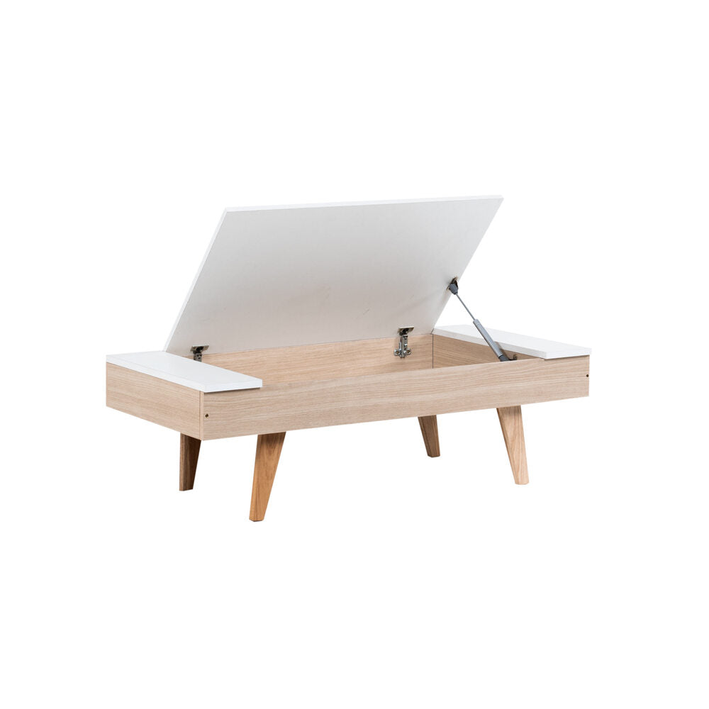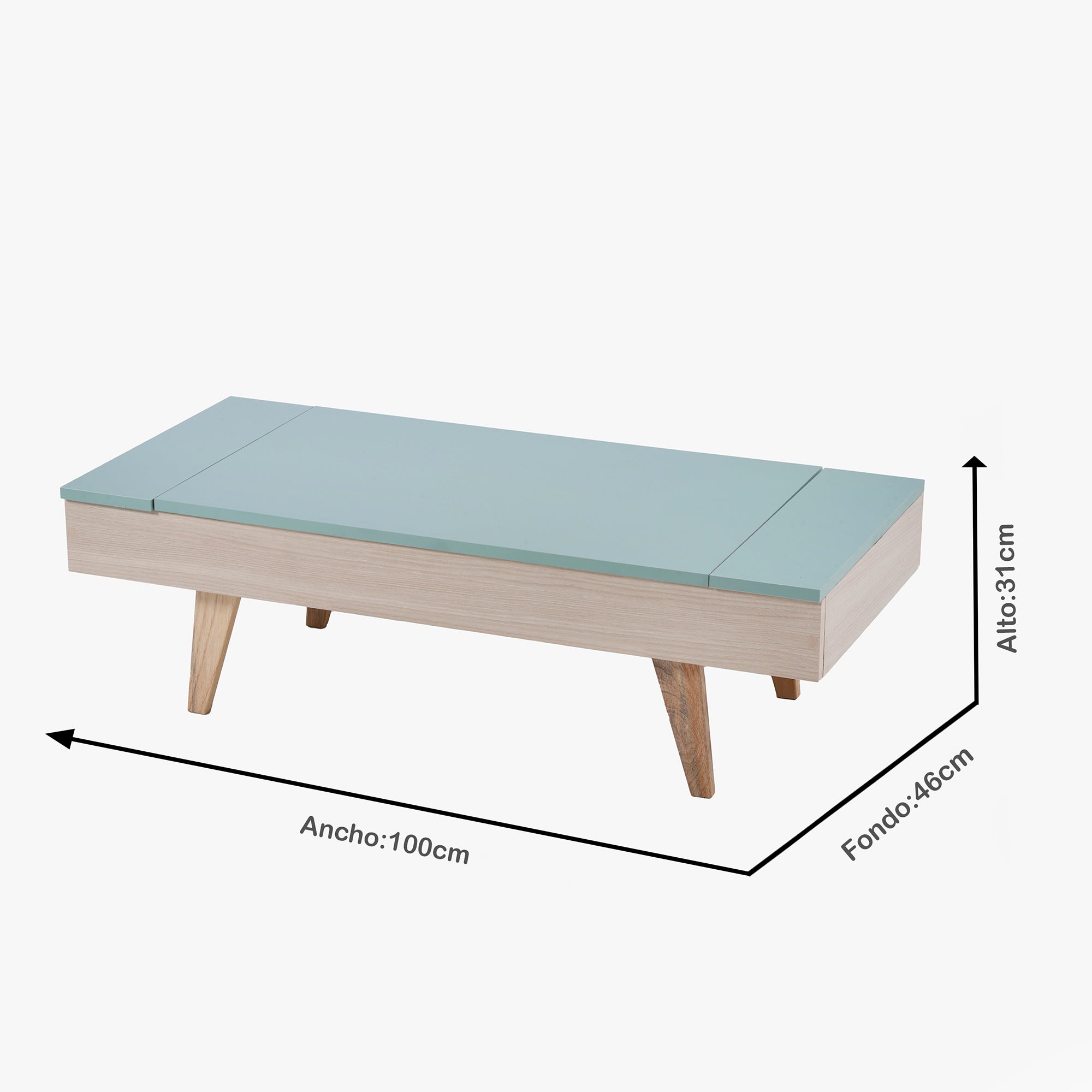 Mesa de centro con almacenamiento interno, fabricada en madera laminada, Moscova, elaborada en madera laminada, dos colores, posee compartimiento interno para el almacenaje de revistas, libros y objetos de uso frecuente, cuenta con una tapa en terminado mate con mecanismo hidráulico de apertura y cierre, sus patas de madera con corte en ángulo le asignan una apariencia sobria y estilizada, esta mesa puede ser fácilmente coordinada con muebles con detalles en madera natural y telas de textura suave y sedosa.