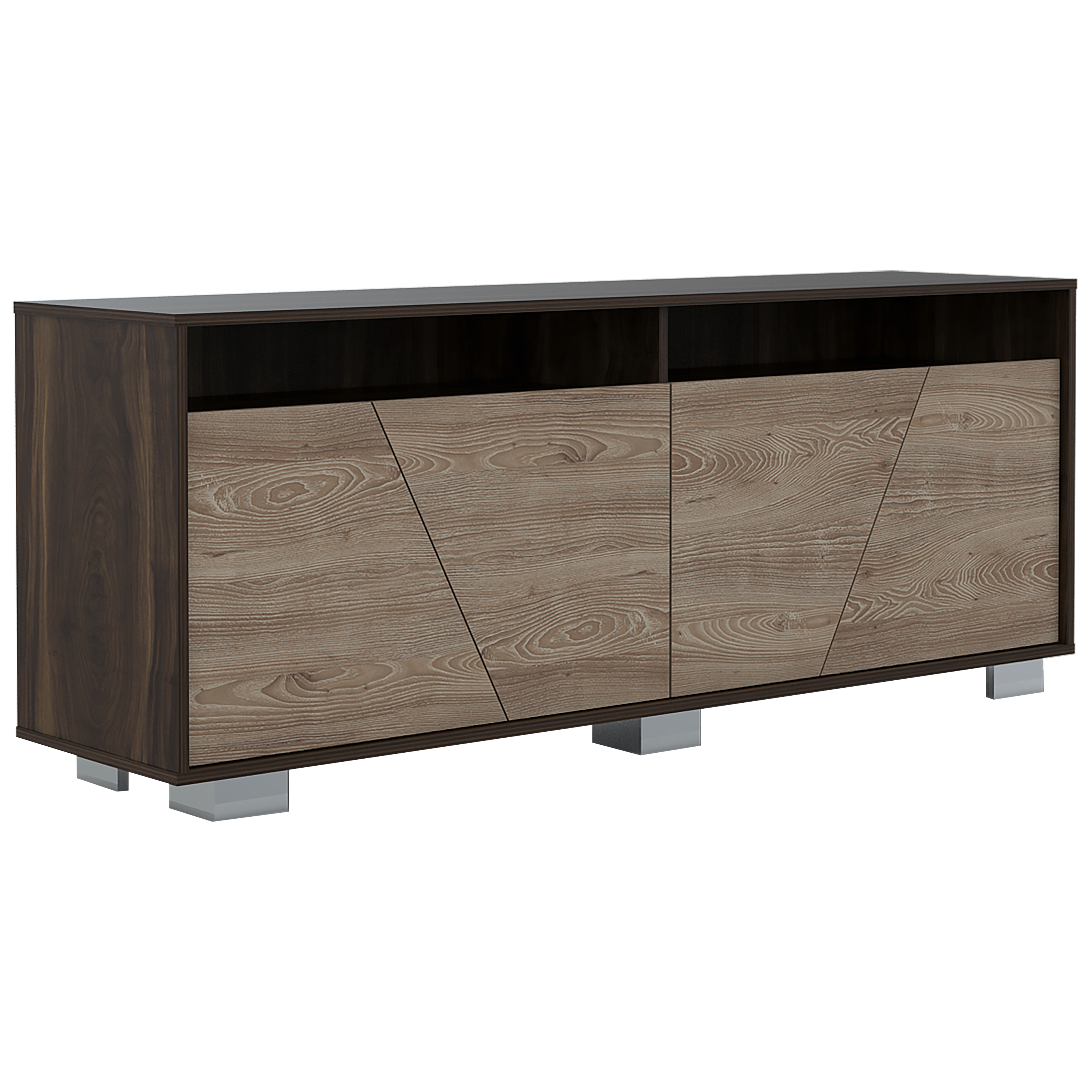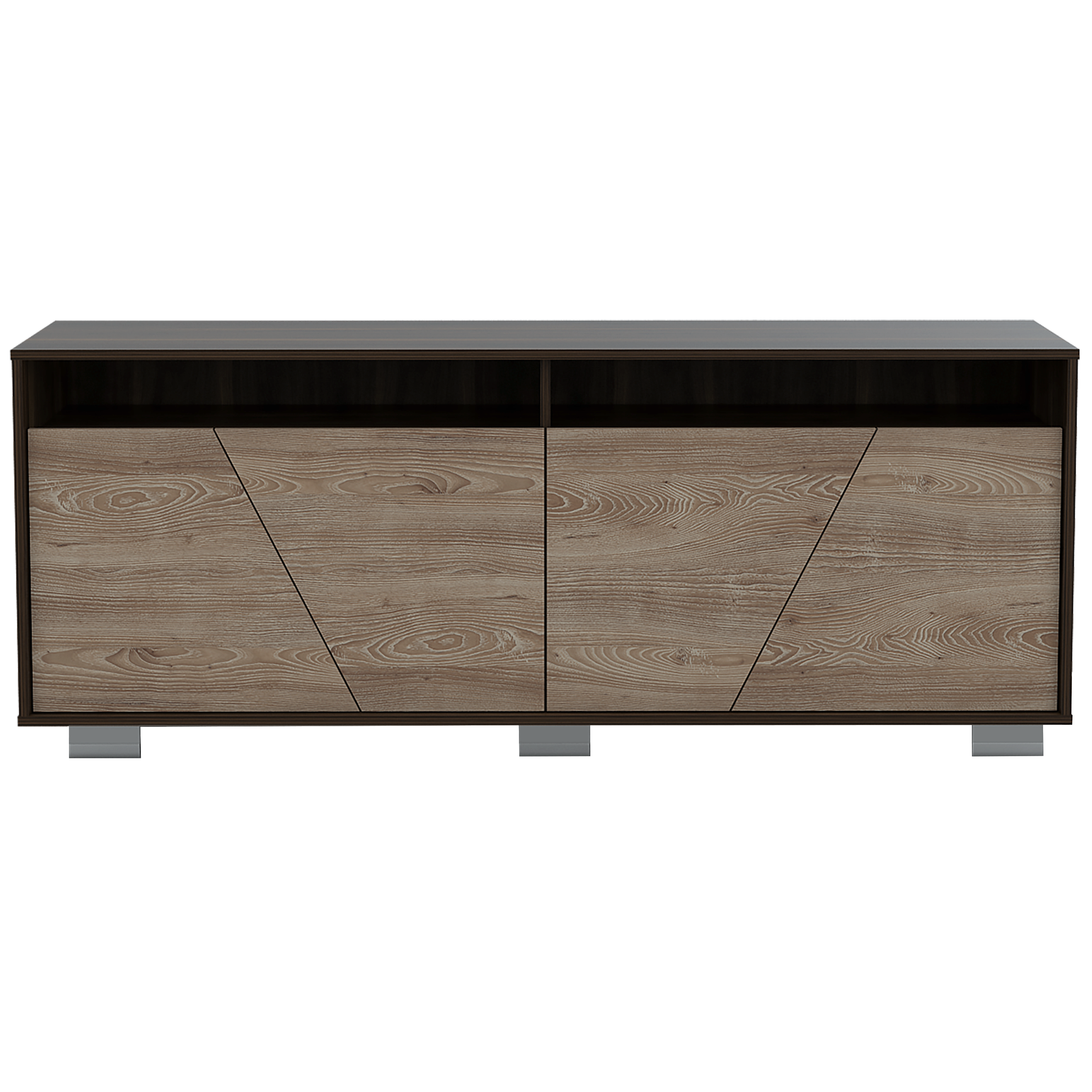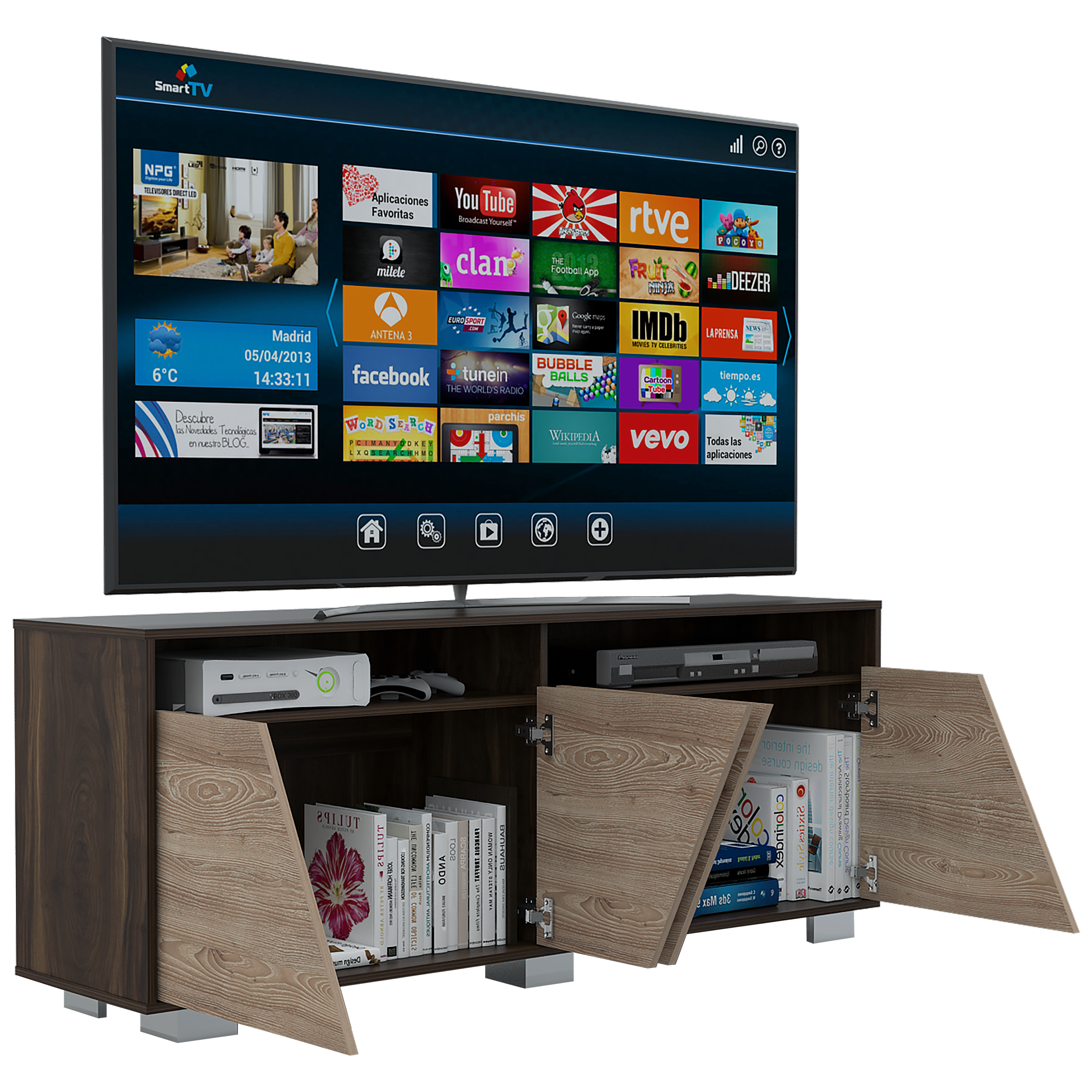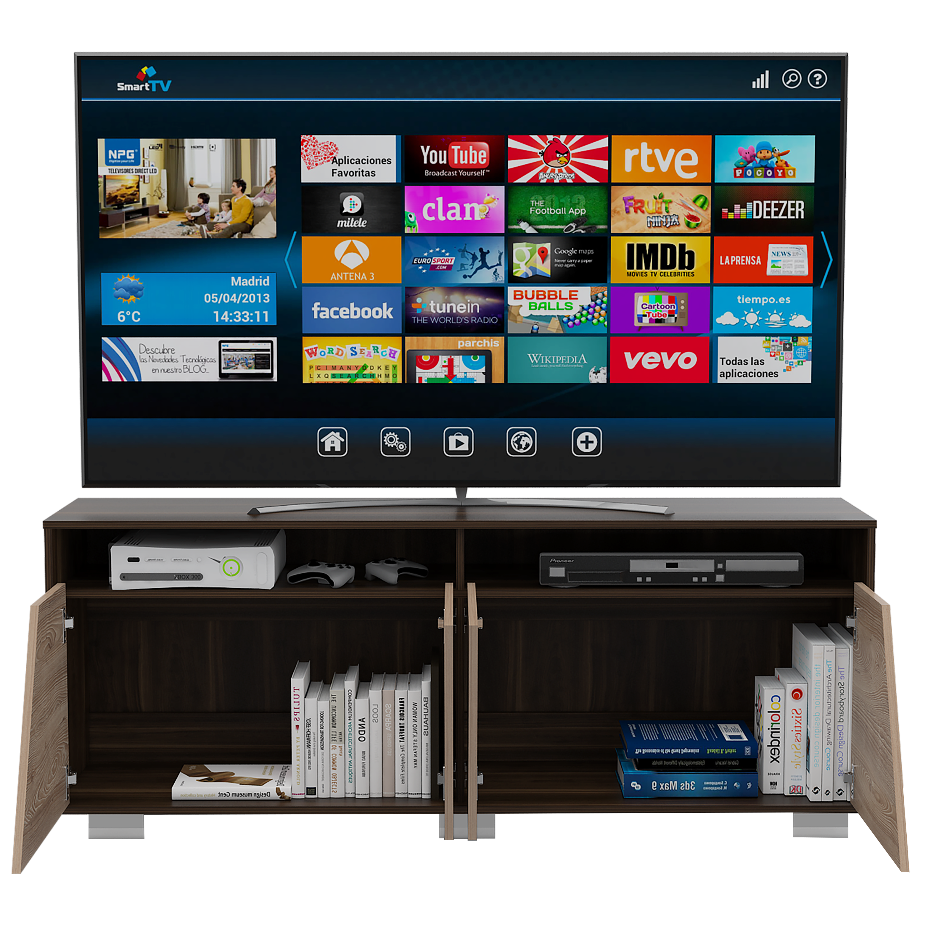 Rack para TV de 70'' máximo, con espacios inferiores para colocar objetos decorativos y equipos de audio y video