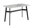 Mesa de comedor de estilo moderno, con cubierta rectangular en acabado claro de piedra sinterizada cerámica y bordes suavemente redondeados. Cuenta con estructura metálica negra reforzada con travesaño central, lo que garantiza mayor estabilidad y durabilidad. Ideal para espacios contemporáneos que buscan un diseño elegante, sobrio y funcional.