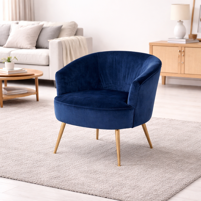 La Poltrona Eugenia aporta un toque contemporáneo y elegante a cualquier espacio. Su diseño envolvente con brazos ofrece una sensación de comodidad ideal para relajarte, mientras que su color azul y las patas doradas la convierten en un complemento decorativo versátil, perfecto para acompañar tu sofá o destacar en un rincón especial de la sala o habitación.