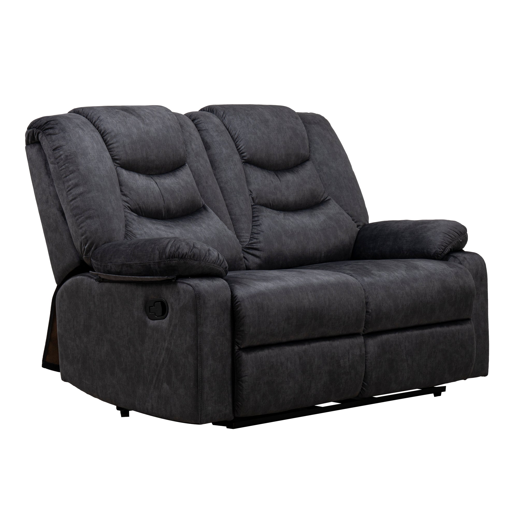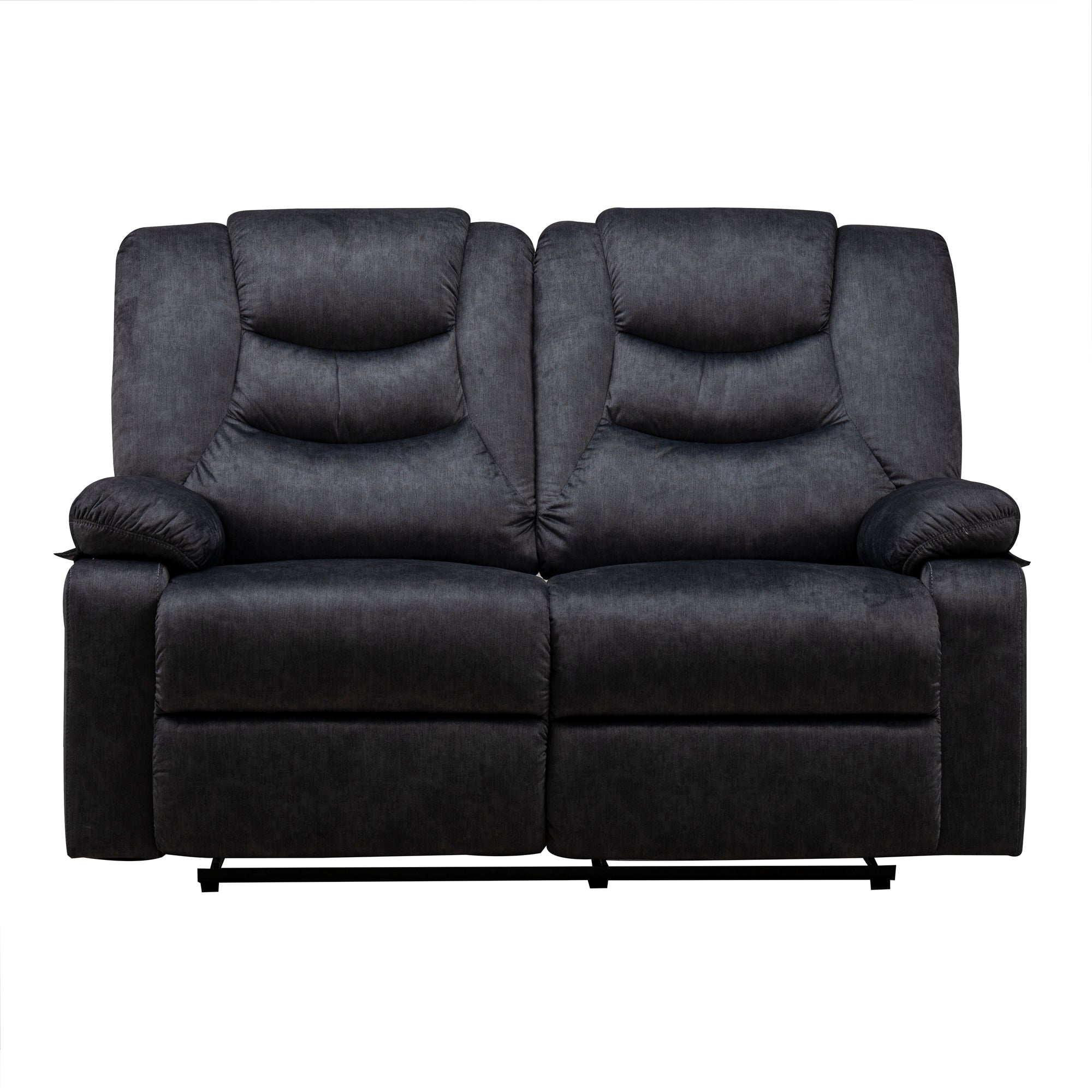 Sofá reclinable de estilo moderno, dos puestos, cubierta en tela de fácil limpieza, base en metal para mayor resistencia y estabilidad, reposabrazos removibles con cremallera y velcro.