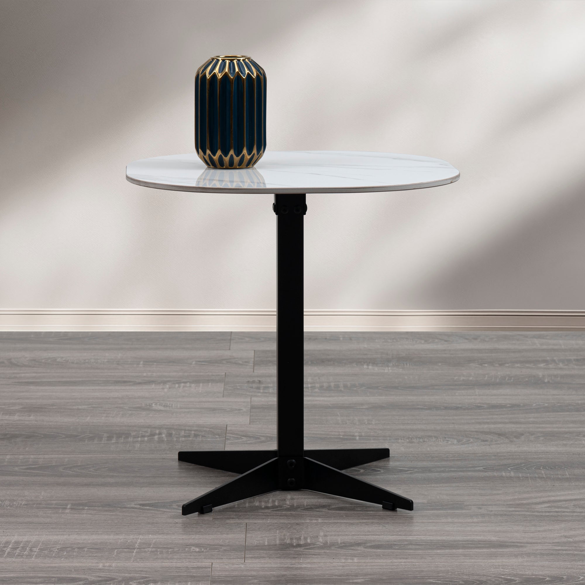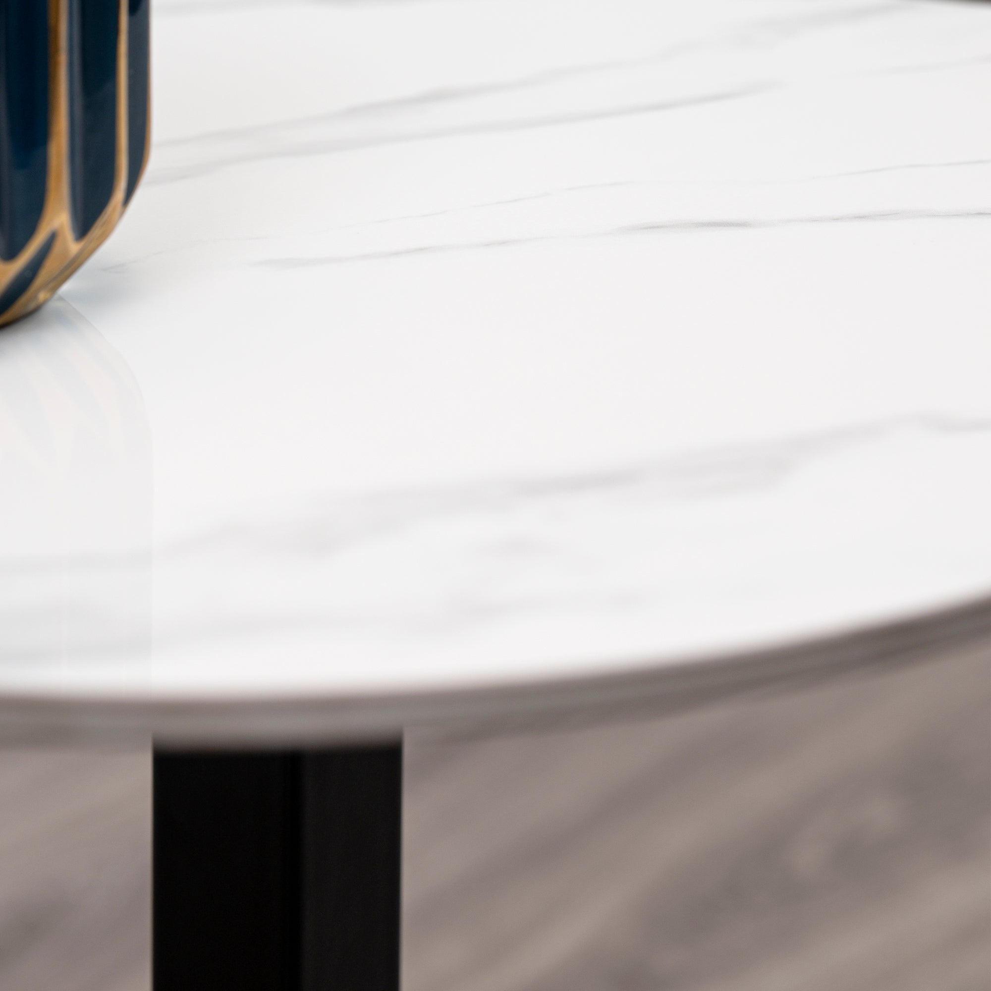 La mesa auxiliar Shadia es la combinación perfecta entre elegancia y funcionalidad. Su cubierta circular en tono blanco tipo mármol añade un toque sofisticado a cualquier ambiente, mientras que su base metálica negra con diseño en cruz ofrece estabilidad y un aire moderno.