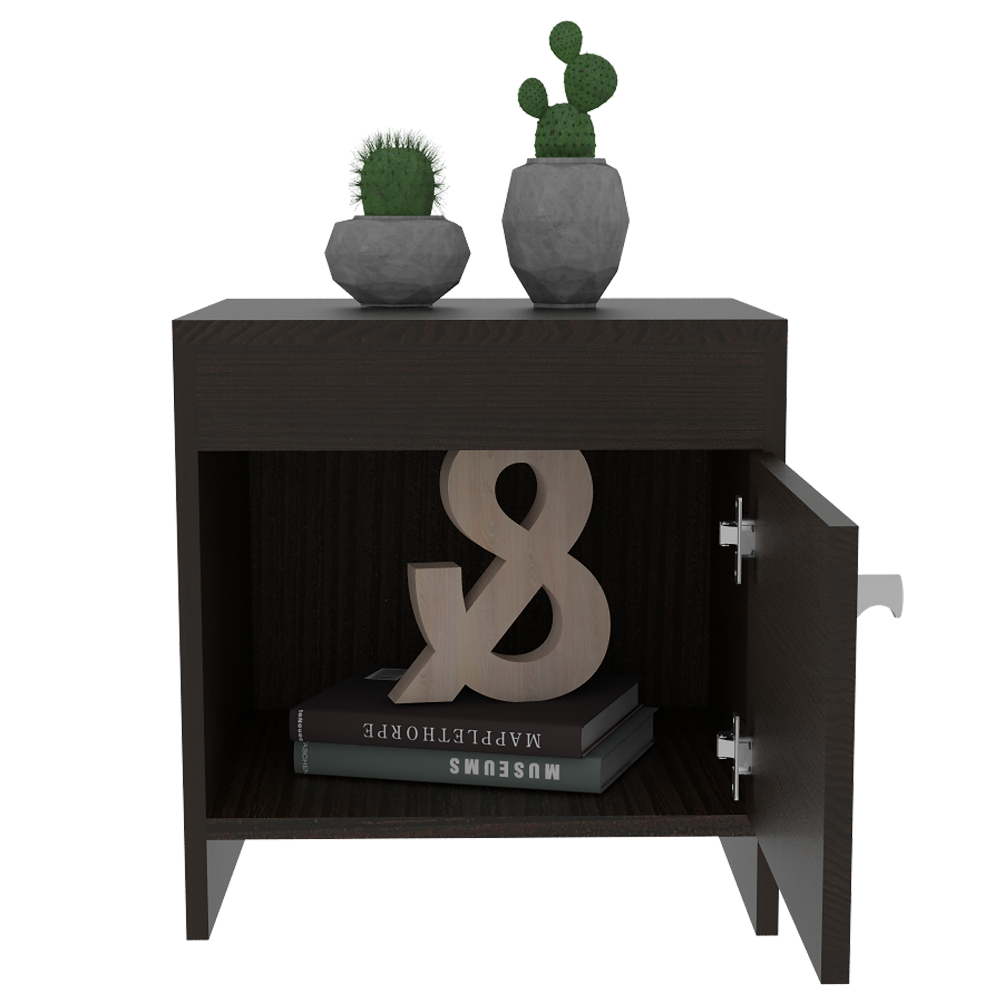 Elegante y funcional, la Mesa de Noche color Wengue aporta calidez y estilo a tu habitación. Su acabado moderno y su práctico espacio de almacenamiento la convierten en el complemento perfecto para mantener todo a mano y organizado.